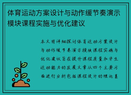 本文围绕“体育散打方案与训练动作库的系统化管理与优化实施方案”展开讨论,重点探讨如何通过科学合理的管理和优化方案提升体育散打训练效果。文章从四个方面详细阐述了体育散打方案与训练动作库的管理和优化措施,包括方案的系统化构建、动作库的分类与精细化管理、智能化工具的运用以及训练效果的评估与反馈机制。每一方面都从实际操作的角度出发,结合现有的管理与训练方法,提出了针对性的优化方案。通过这些措施的落实,可以...